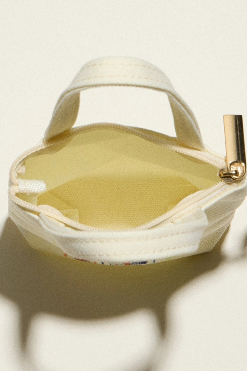 A charming mini canvas pouch featuring a soft, Mediterranean-inspired lemon graphic with a vintage tile–style aesthetic. It’s perfect for holding coins, keys, lip balm, or small essentials. Finished with a short carry handle and an attached chain keyring, this pouch is lightweight, practical, and giftable.