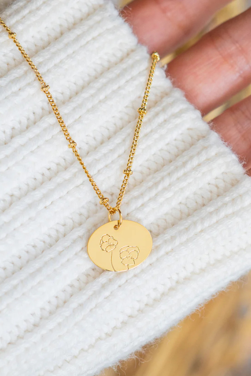 Celebrate your birth month with the beautifully engraved Birth Month Flower Necklace. Featuring a delicately etched floral design that corresponds to the flower of your birth month, elegantly displayed on a beaded, adjustable chain. Perfect for personal wear or as a thoughtful, personalized gift