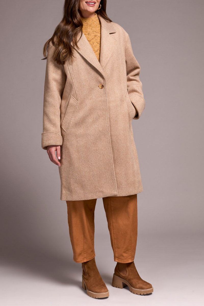 This classic coat is sophisticated and stylish with a subtle herringbone detail in a soft tan color. Features include a beautiful collar, detailed button front, and cuff sleeve.