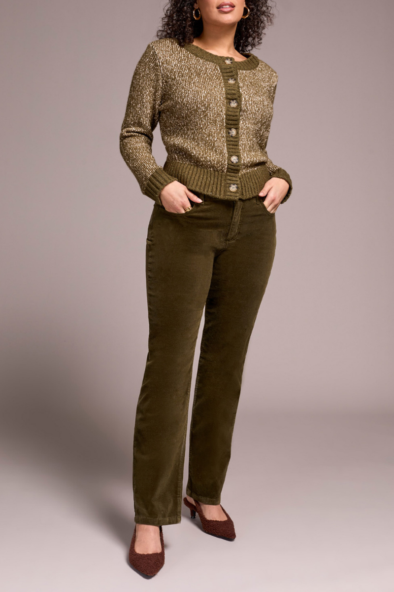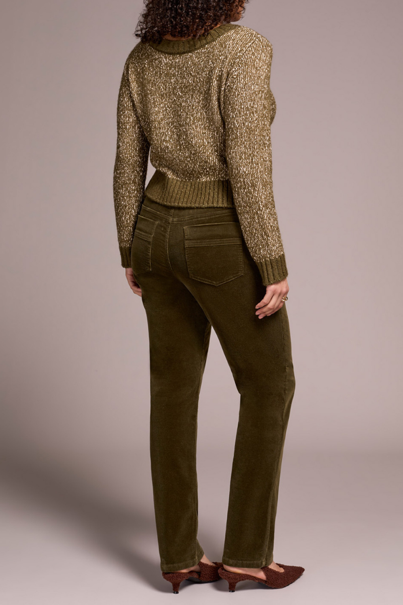 The corduroy pant is a sophisticated silhouette with a classic straight leg and comfortable stretch. Features include a rich ivy color, 5 pockets and button and fly closure.
