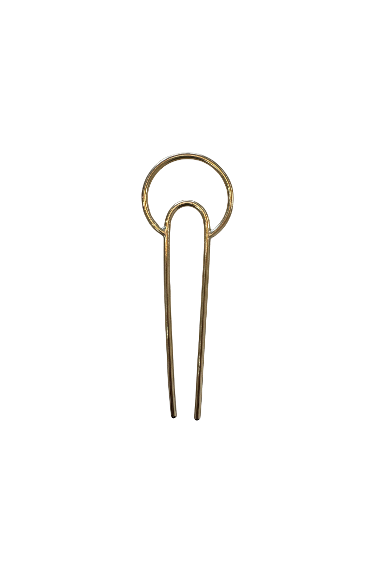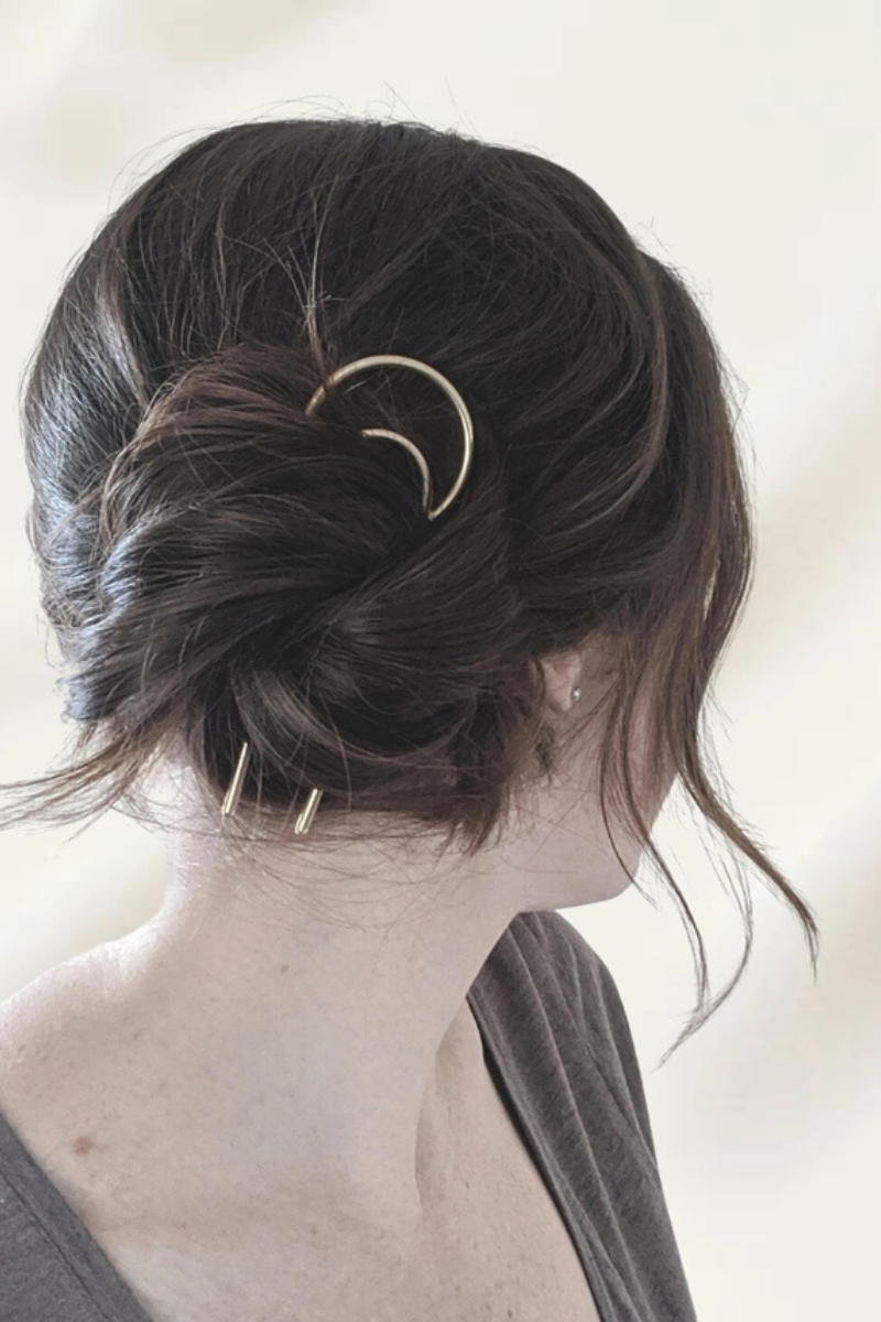 A 'U' shaped hair fork, simple and classic, with the addition of a crescent shape that will show nicely outside of your bun/twist. Weave the hair fork through your hair to create tension for an all day hold!