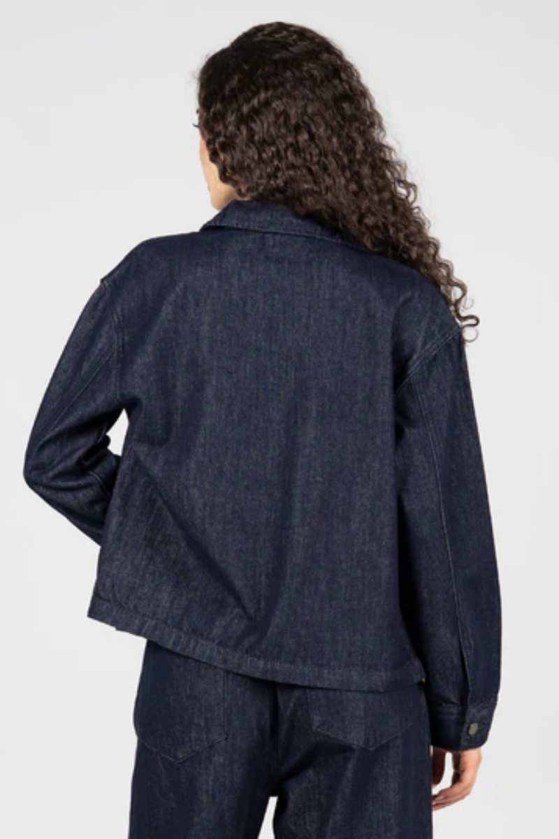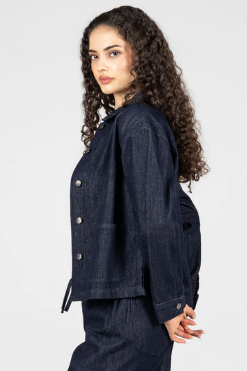 Classic button front dark denim jacket in a relaxed fit. Featuring front patch pockets.