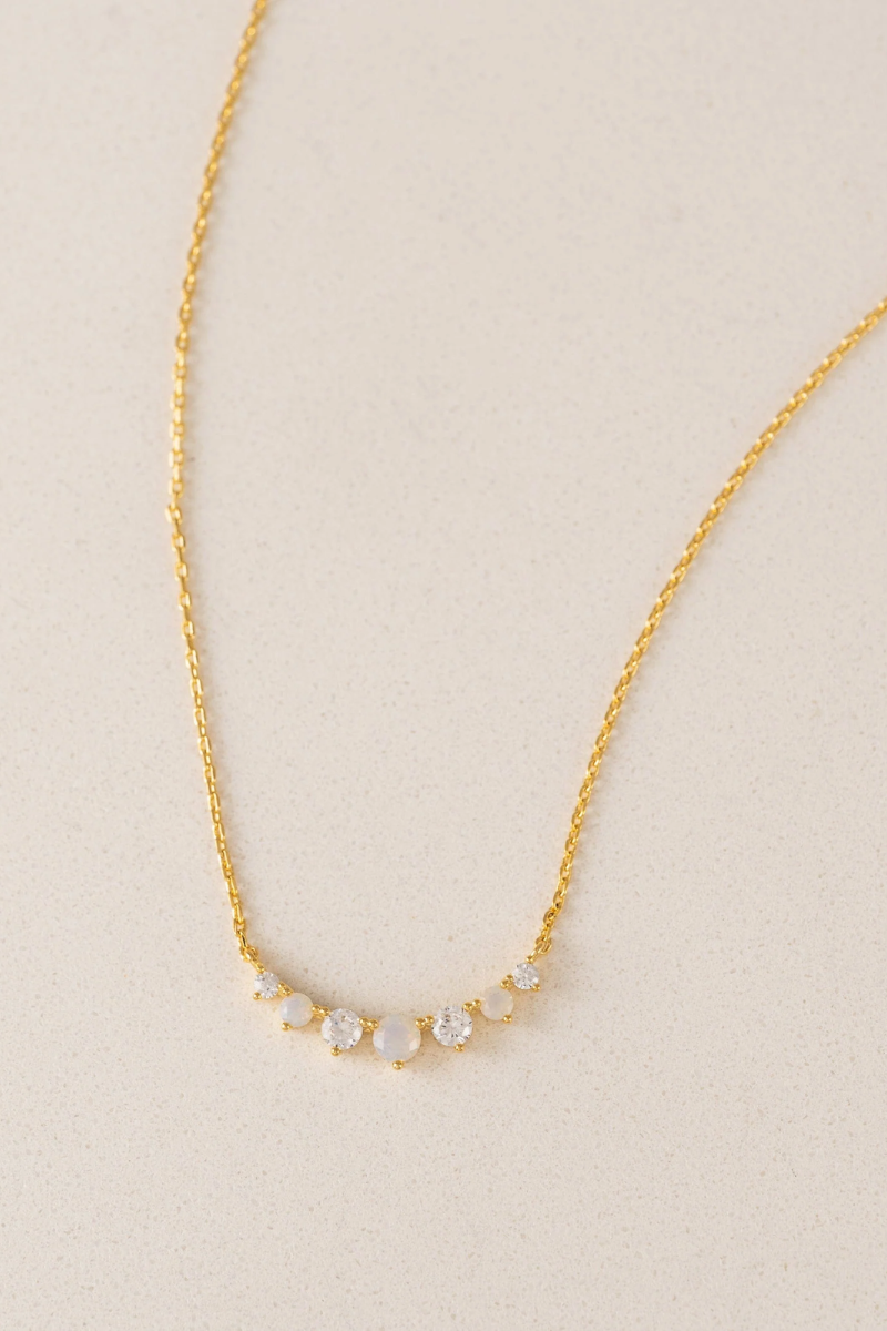This dainty necklace features a mix of opal and clear cubic zirconia's that catch the light—and compliments—without trying too hard. Made of electroplated brass with cubic zirconia, it’s dreamy, dainty, and destined to be layered.