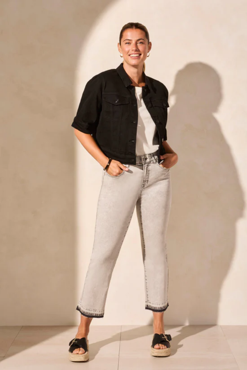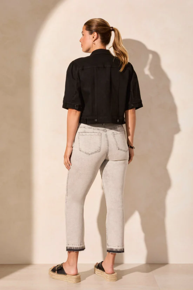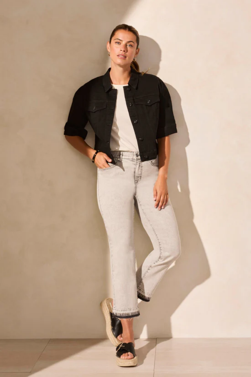 Complete your ensemble with this button-up denim jacket, featuring stylish elbow-length sleeves. Chest pockets and a tailored collar add classic structure to this timeless piece. The cropped length provides a contemporary waist, while the stretch denim ensures all-day comfort.