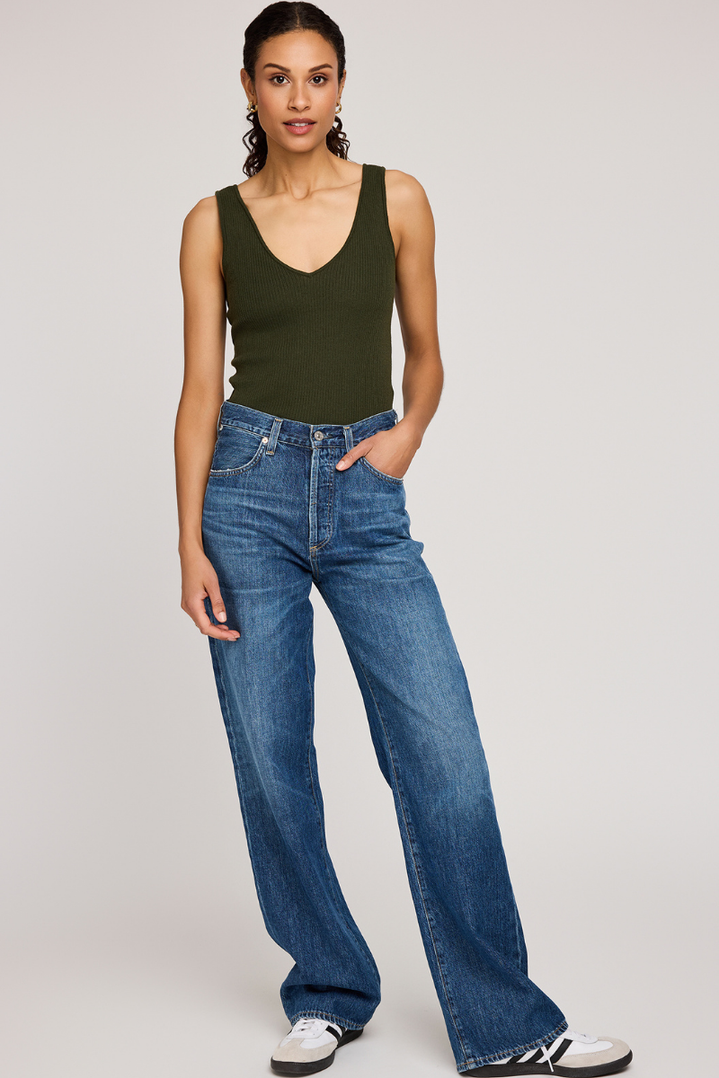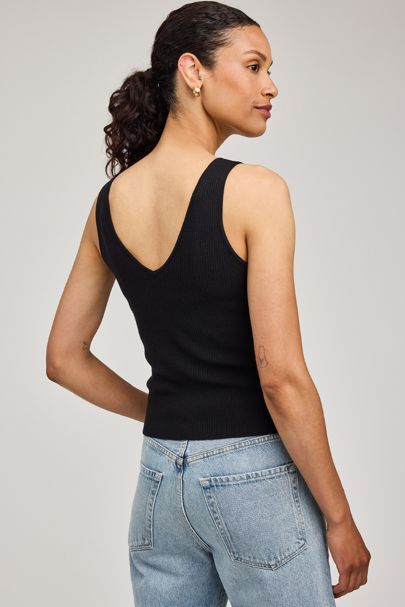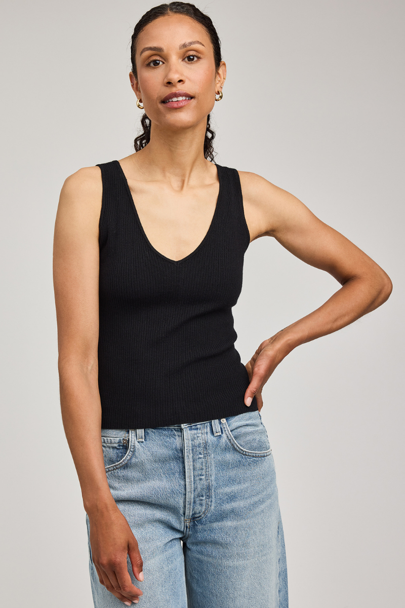 Soft vneck tank. Ribbed, fitted and waist length. V detail both in the front and back. Available in multiple colors.