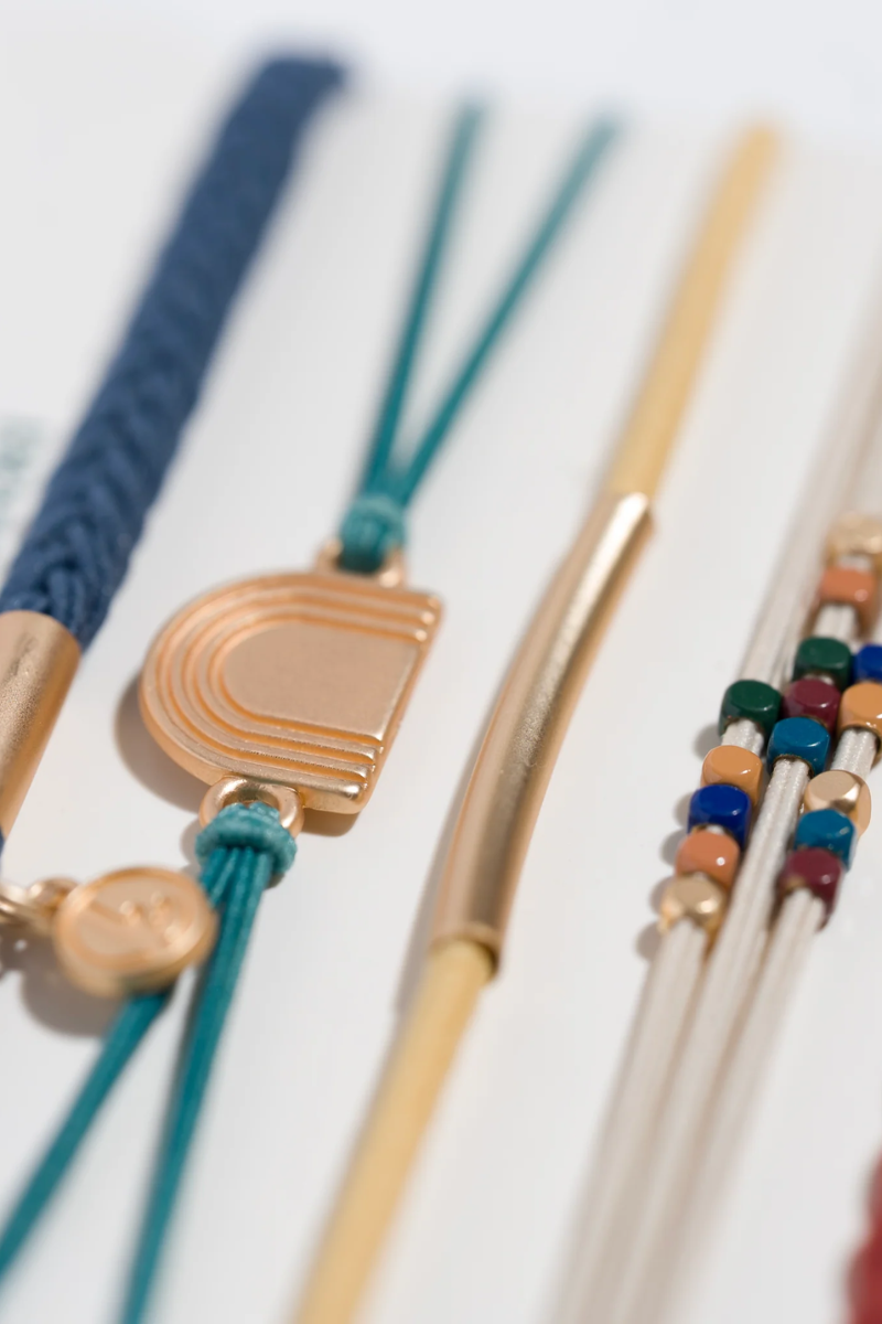 The set comes with 5 hair tie bracelets in complimentary tones, including different bands with gold charms and bead details. Stylish to wear as a bracelet, but functions beautifully as a comfortable hair tie.