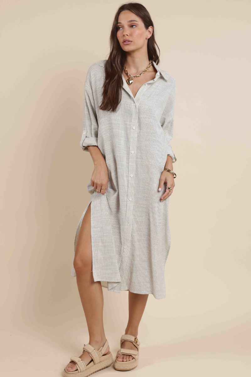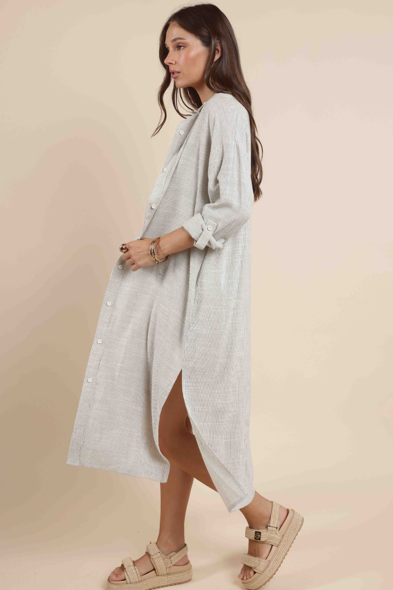 Wear open as a duster, or closed as a shirt dress. The Mojave Shirt Dress holds such versatility with the simple, sleek striped pattern.
