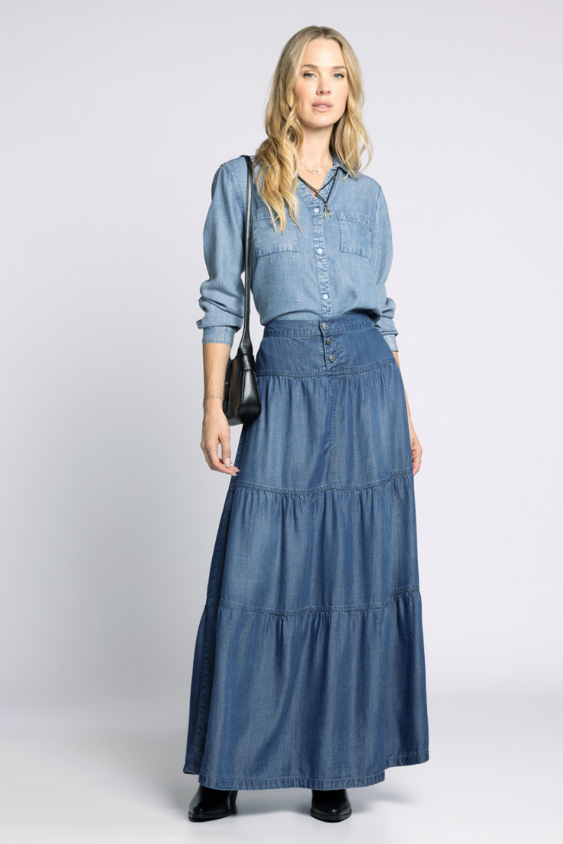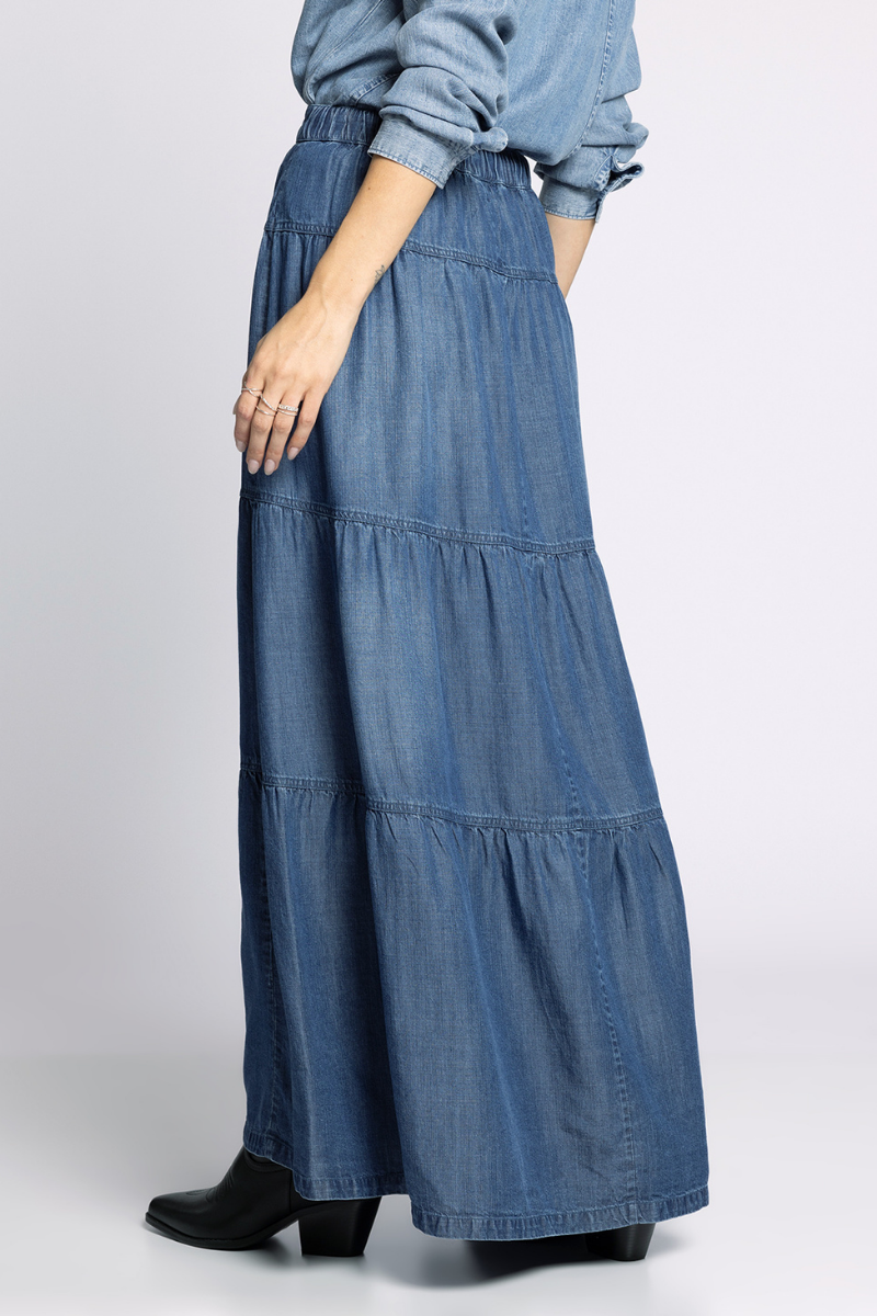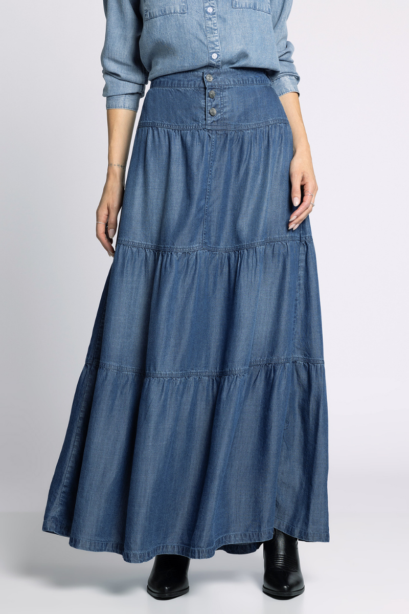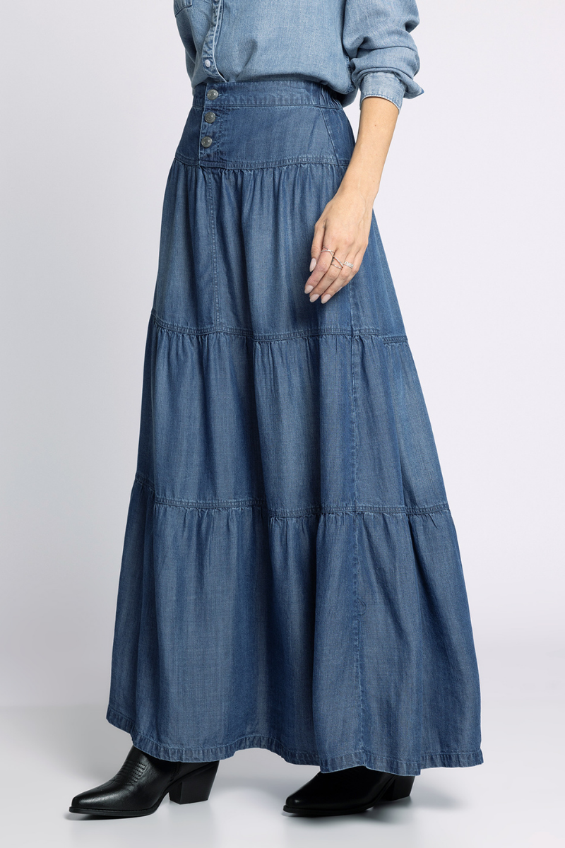 The Montie Denim Skirt features 4 tiers, 3 button waist closure, and an elasticated back waistband.