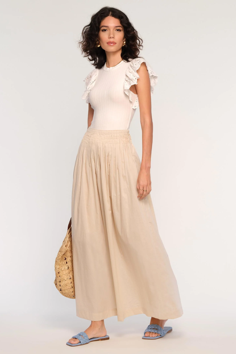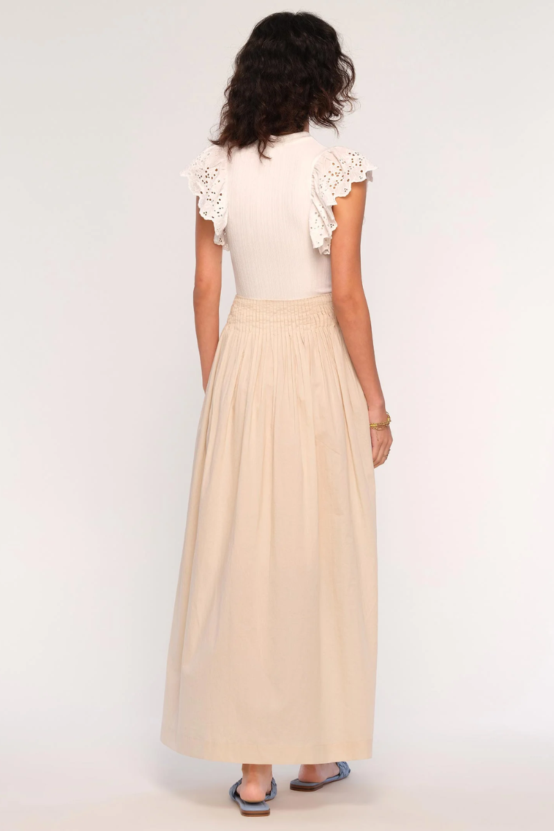 The Renee Skirt is made from a lightweight, washed, cotton voile. Its a maxi skirt with delicate pintucks across the edge. Pair it with your favorite cami and oversized bag.