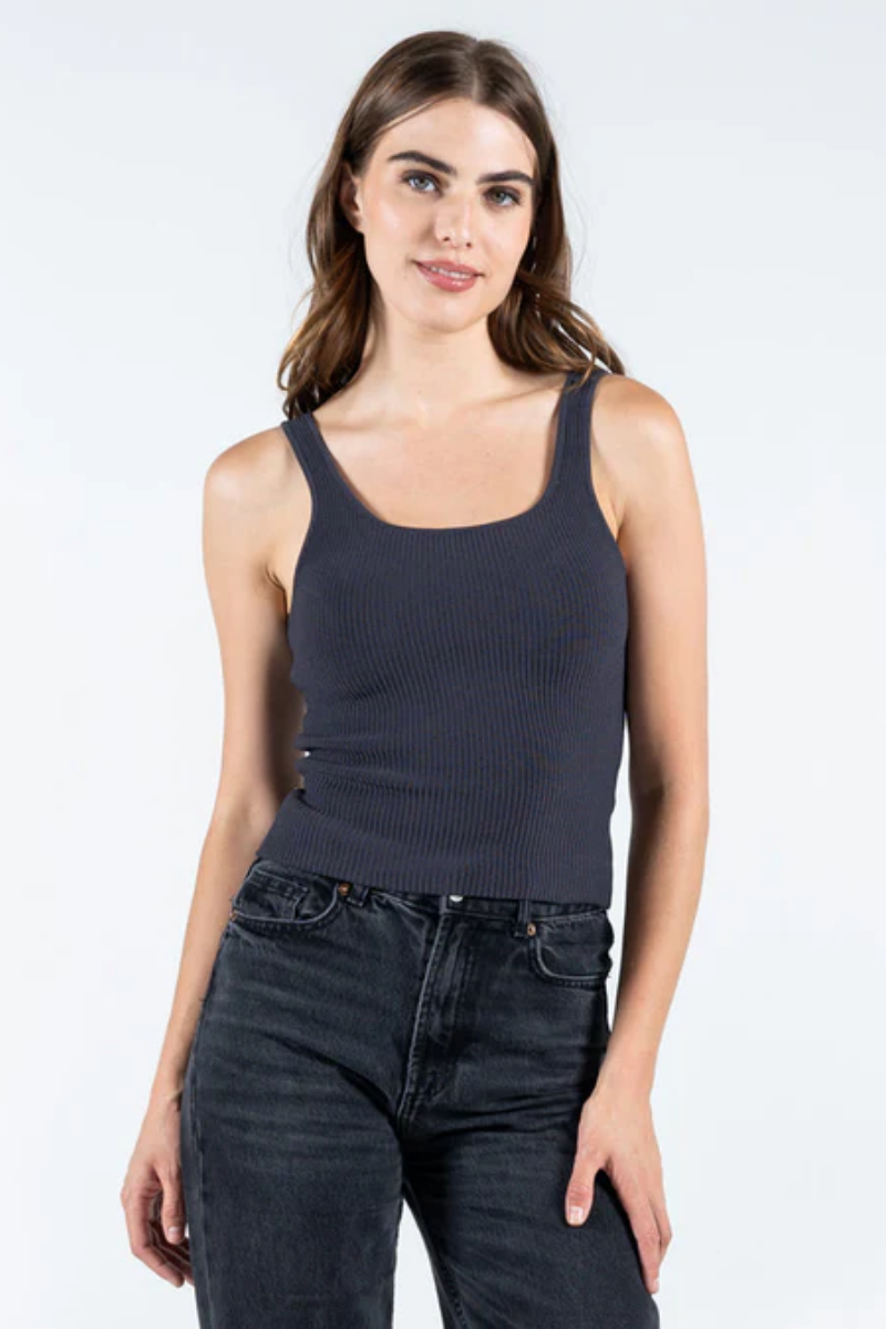 This sleek tank features a square neckline with a tailored silhouette, crafted from ottoman-textured fabric with strategic ribbing that creates a refined, structured appearance. The blend of 99% nylon and 1% spandex delivers both durability and subtle stretch for comfortable wear.