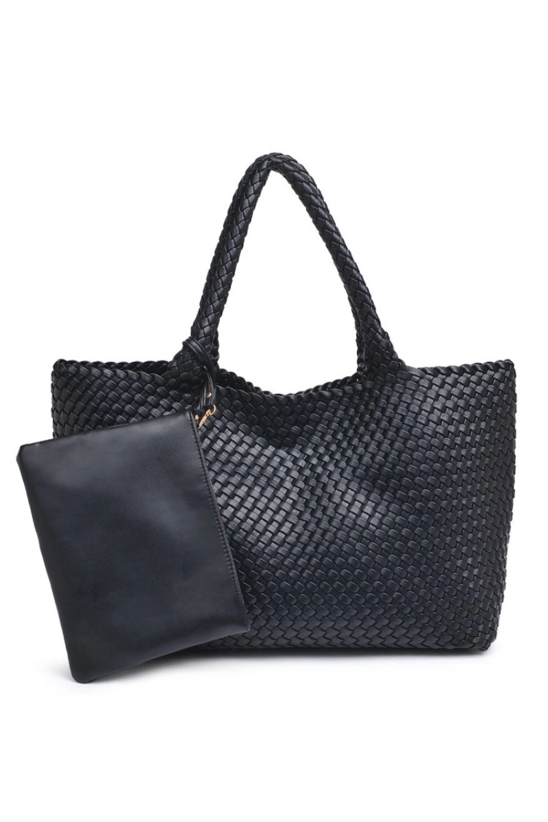 The perfect tote for all of your needs. Crafted with luxurious and lightweight vegan leather, this bag features a woven all-over and a magnetic closure to keep your belongings safe and secure. The inside is unlined and comes complete with an added zipper pouch for some extra storage that can also be used as a hanging accessory. With a handle drop measuring 10”, you will never lose your grip while on the go.