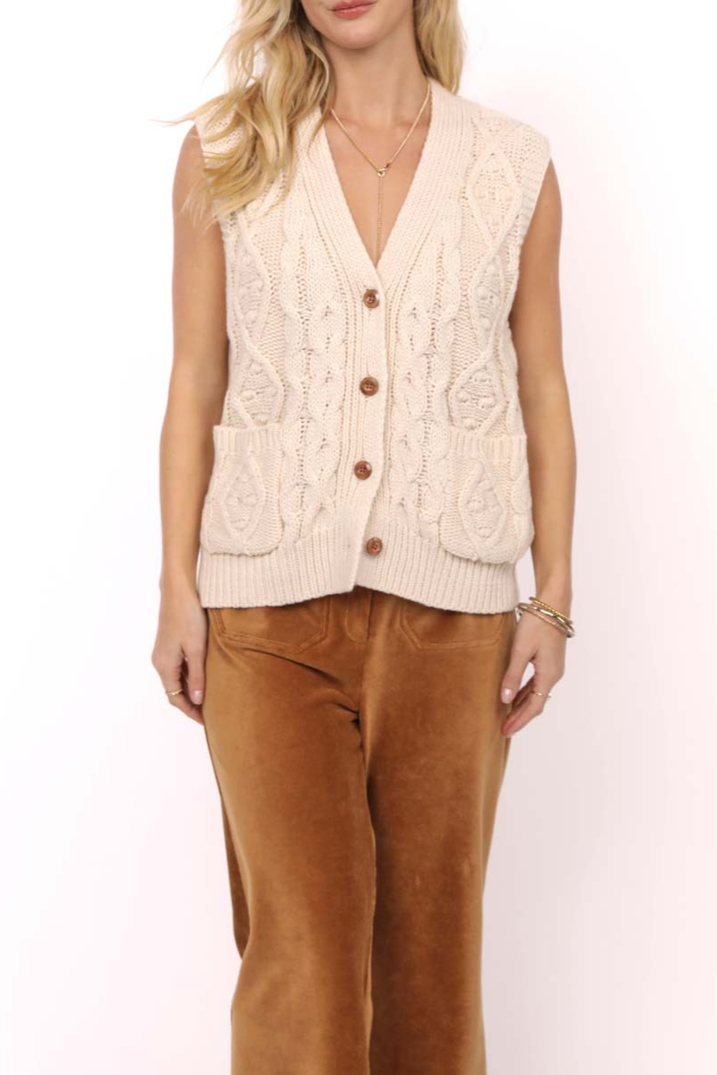 Add a cozy, vintage- inspired layer to your wardrobe with this classic cable knit sweater vest. Crafted in a soft cream hue, this sleeveless piece features intricate patterns, a flattering V-neckline, and a front button closure