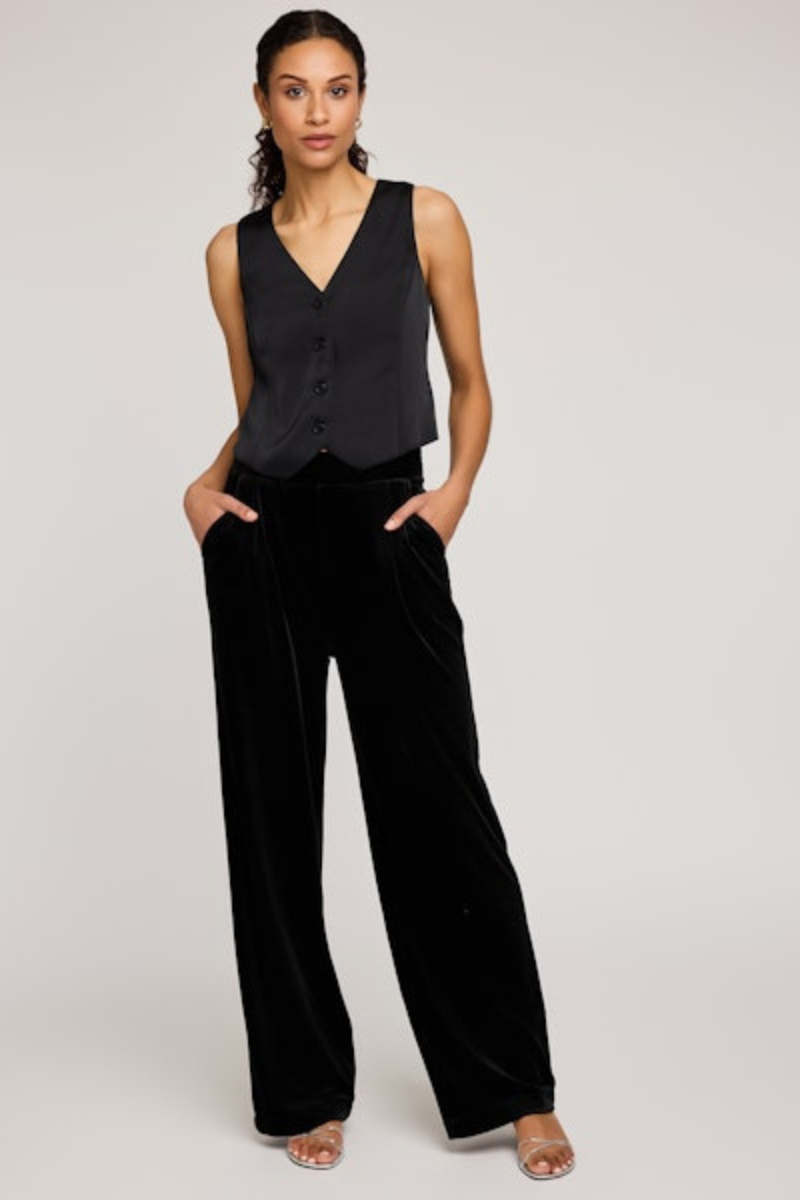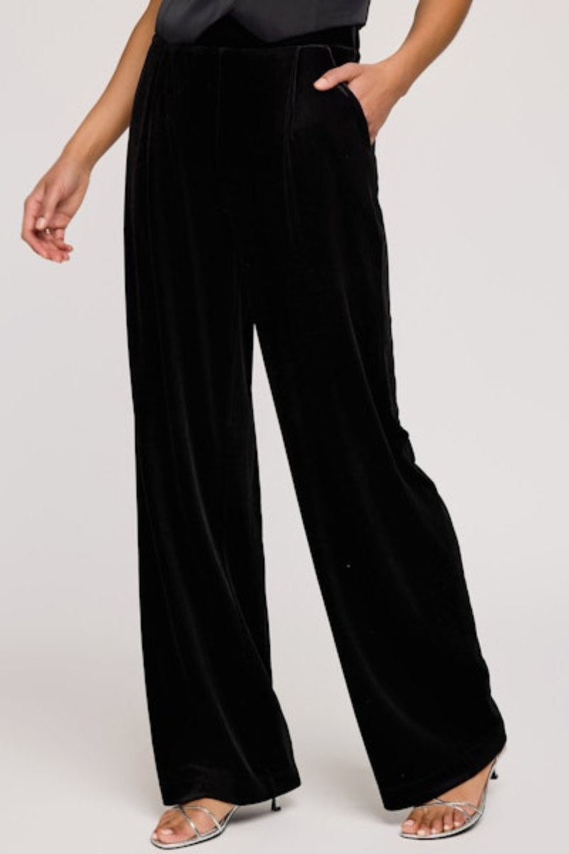 The Sylvia pant is made of a luxe velvet fabric. Features include a wide leg, slash pockets, front pleats and an elasticated waistband.