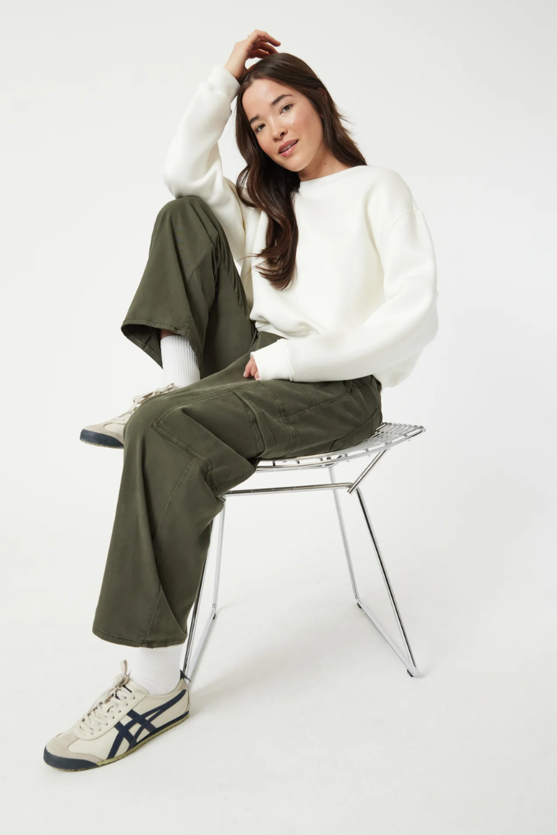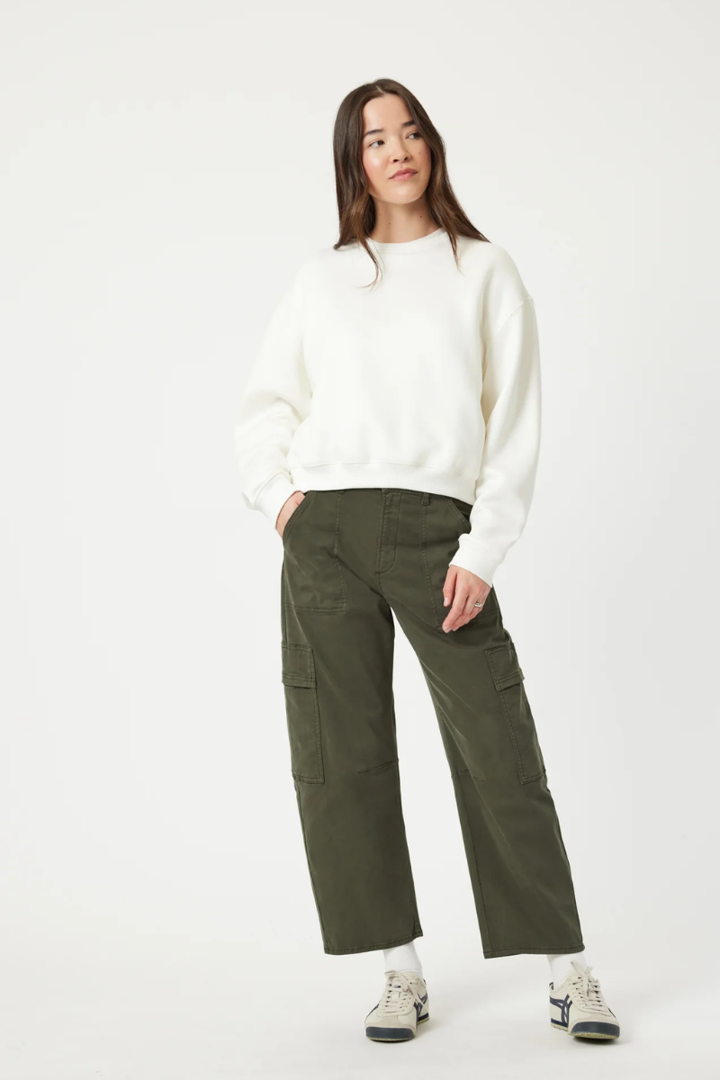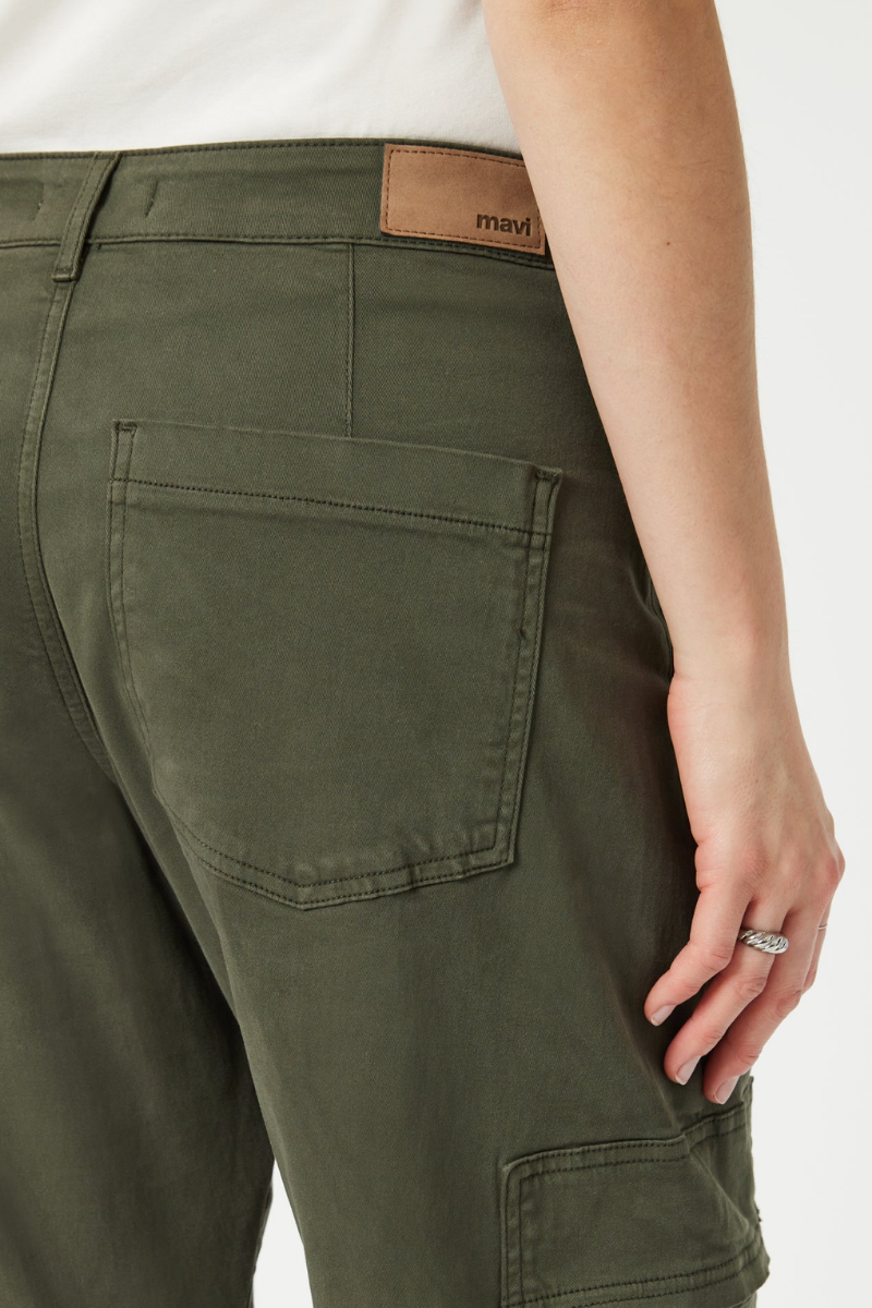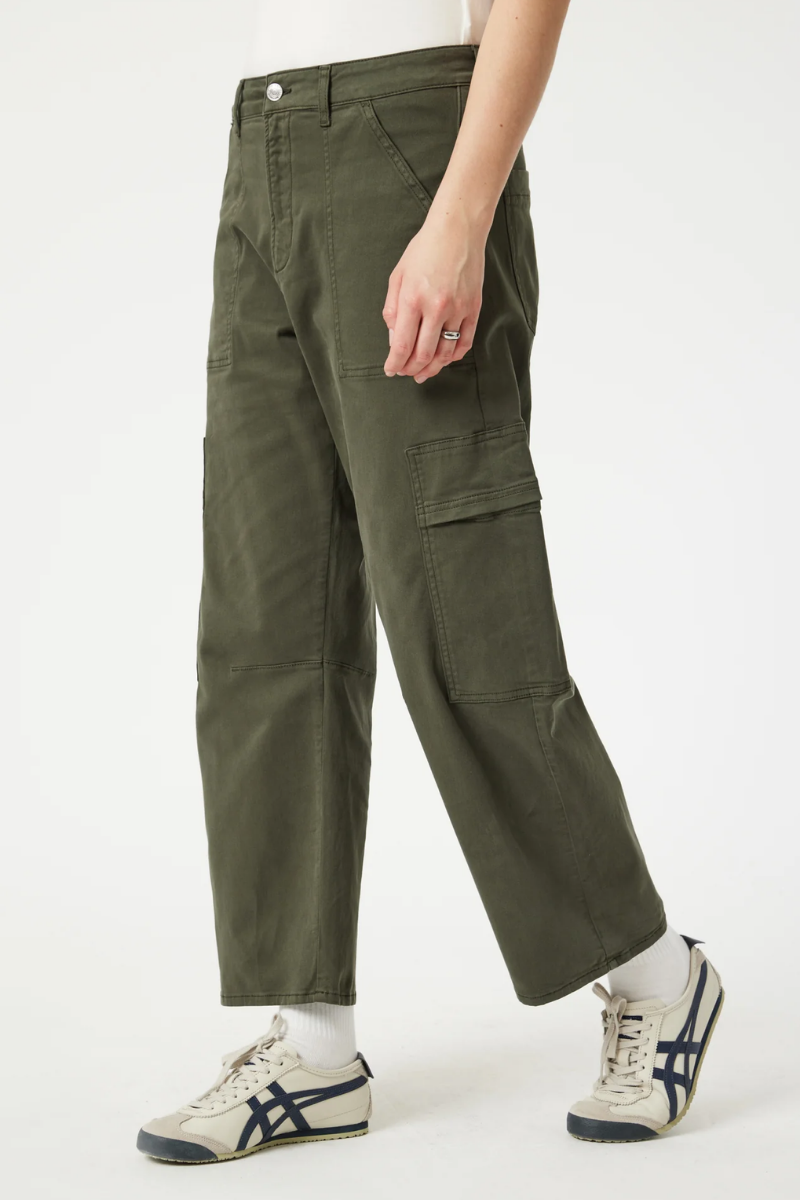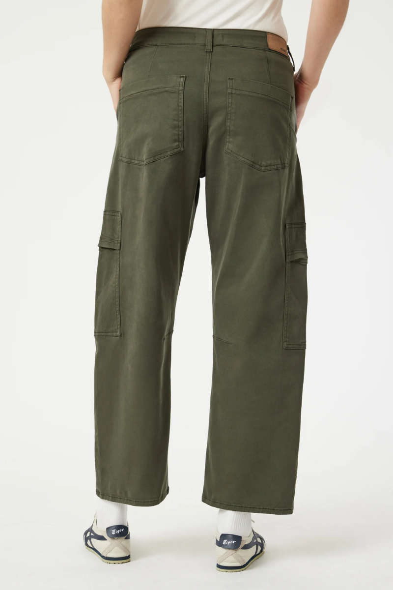 This trendy barrel fit cargo pant has a dramatic silhouette and a flattering high rise. With six pockets and a stretchy twill fabric, this pair is versatile and fashion-forward thanks to a trendy camo green hue.