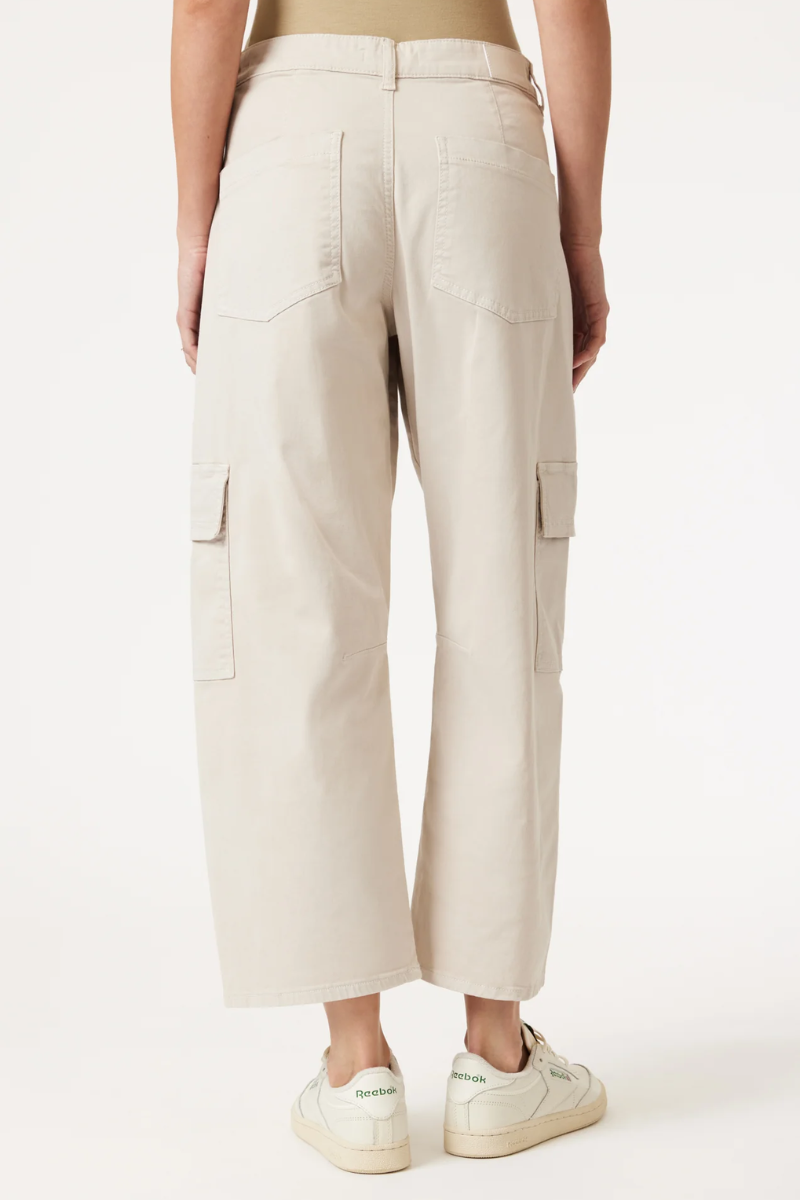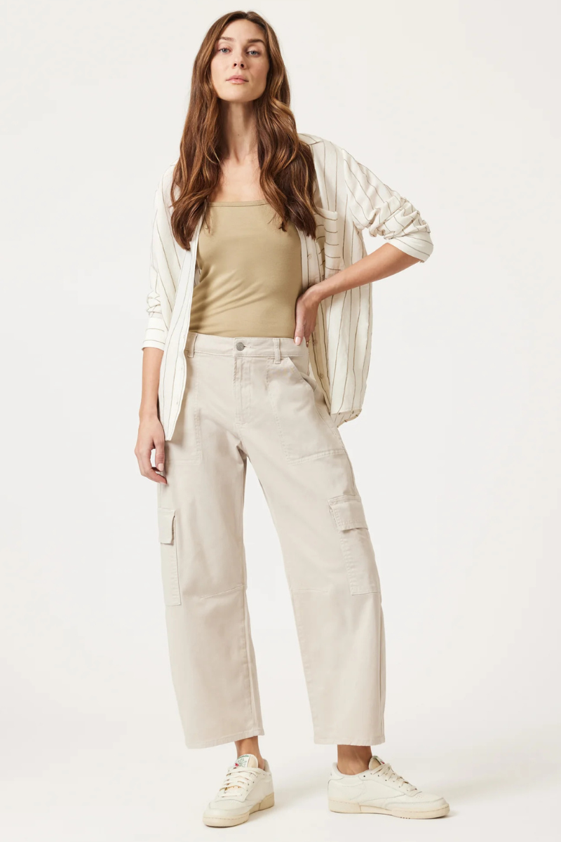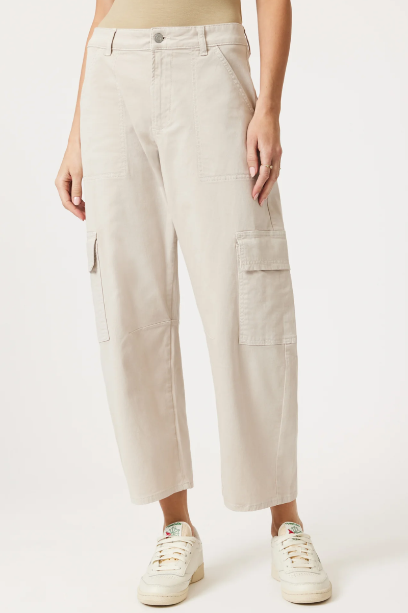 This trendy barrel fit cargo pant has a dramatic silhouette and a flattering high rise. With six pockets and a stretchy twill fabric, this pair is versatile and fashion-forward thanks to a trendy Frost.