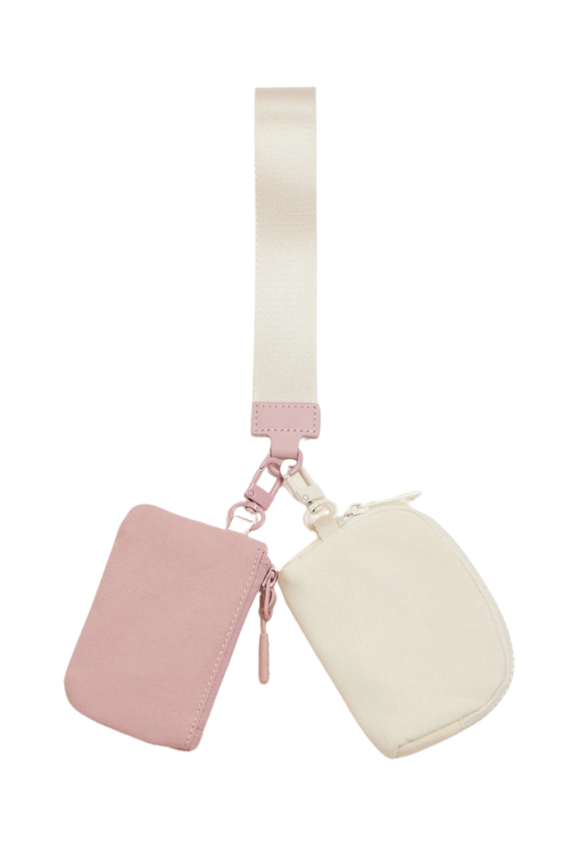 This dual-color coin purse keychain wristlet is a versatile and stylish accessory, perfect for carrying daily essentials. The design features two compact pouches—one in vibrant pink and the other in neutral beige—both connected by a sturdy clasp system. The wristlet strap is crafted from a soft, pale pink material, providing comfort and ease of use.